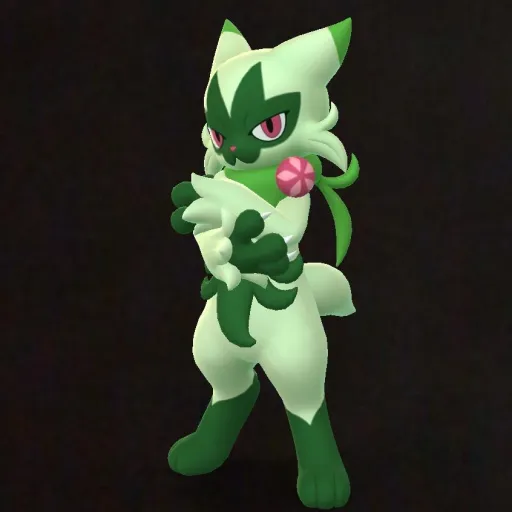 119A female Pokémon with a long and flowing blue hair. She has a beautiful, smiling face with white skin and bright red eyes. She wears a sleeveless, see-through dress that has a side slit and a flower ornament on the left side of her chest. She also wears white elbow gloves with black bows and black gloves that cover her arms. Her dress is bright and colorful with long sleeves that go past her elbows. She stands with her hands behind her head and looks directly at the viewer.
