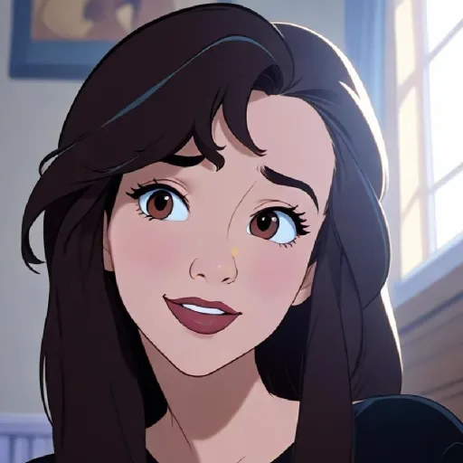 0Lilith, a demon princess, hides her true form behind a human facade. She holds jewelry in her bare hands, revealing her glowing fangs and horns. Her bare shoulders and black footwear showcase her dark elegance. Standing on a rail, her wings spread wide, creating an aura of power. She looks at you with curiosity and defiance.