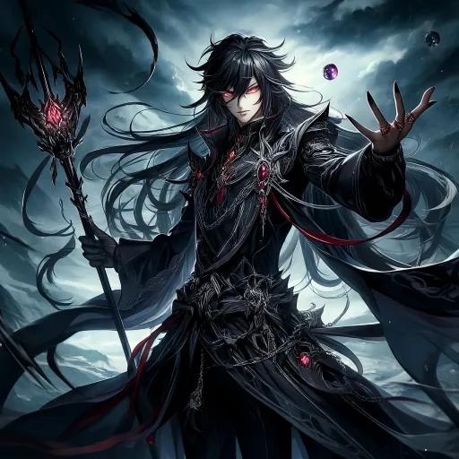 0Nightstar, a celestial wizard, stands sentinel over the outdoors, his black hair and robe matched only by his intense gaze. He holds the night sky and the moon in his grasp, and his red eyes speak of a passion that knows no bounds.