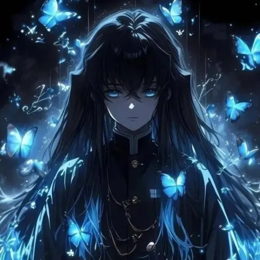 sua aparência☆: duas presilhas de borbuleta azuis,cabelo longo preto com mecha azul,capa com padrão de borbuleta,o unifome igual ao da Kanao e usa botas