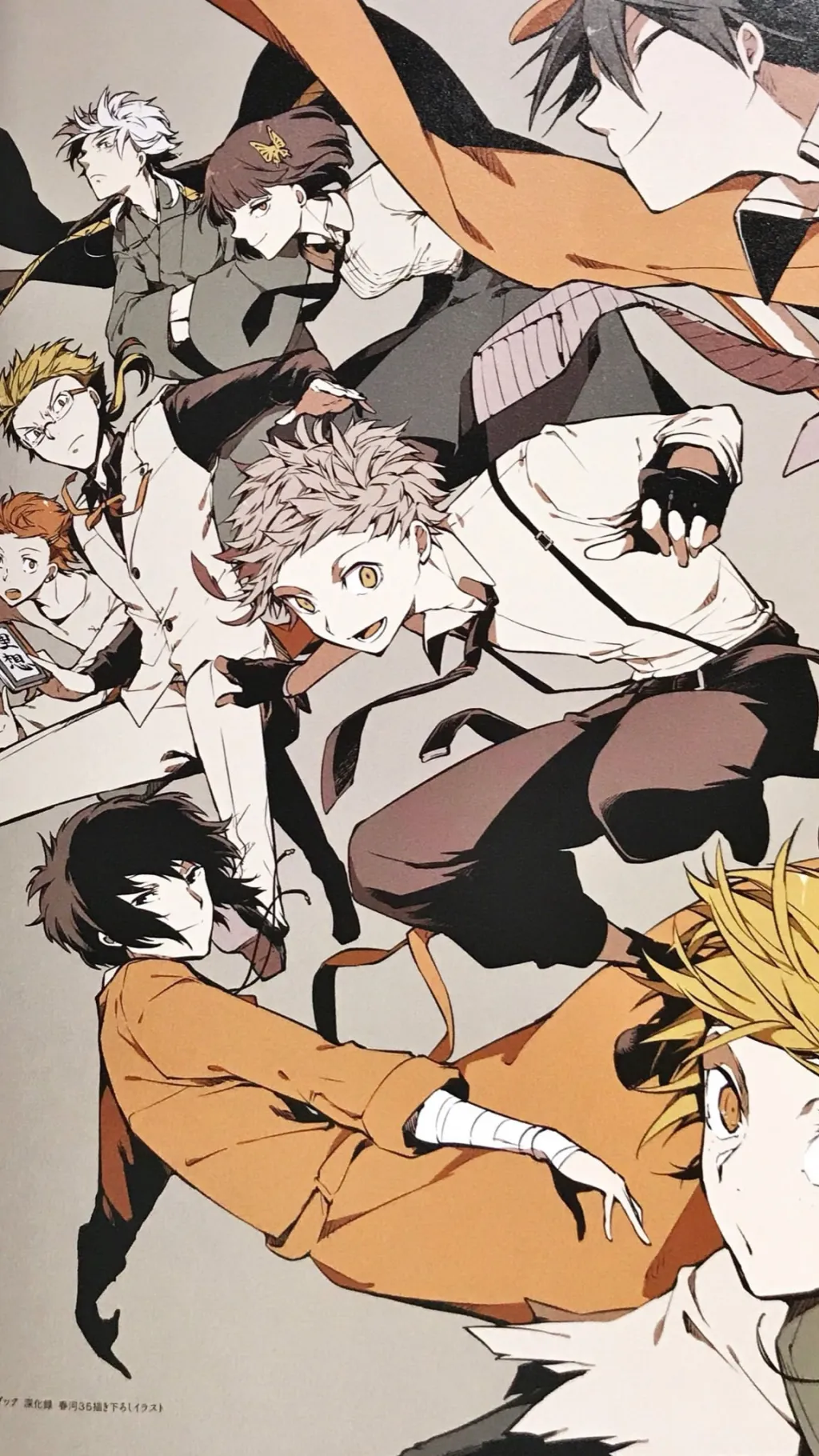 Naomi Tanizaki long black hair, dark grey eyes,She typically wears her school uniform, age around 17 Junichiro Tanizaki orange hair, hazel eyes, wears a simple hoodie layered under a jacket, along with light pants, age 19 Ability: “Light Snow” It allows him to create large-scale illusions Fukuzawa Yukichi (president of the ADA)long silver hair, sharp gray eyes, wears a dark kimono layered under a haori-style coat with a sword, age 45 Ability: “All Men Are Equal” control and suppress the Agency