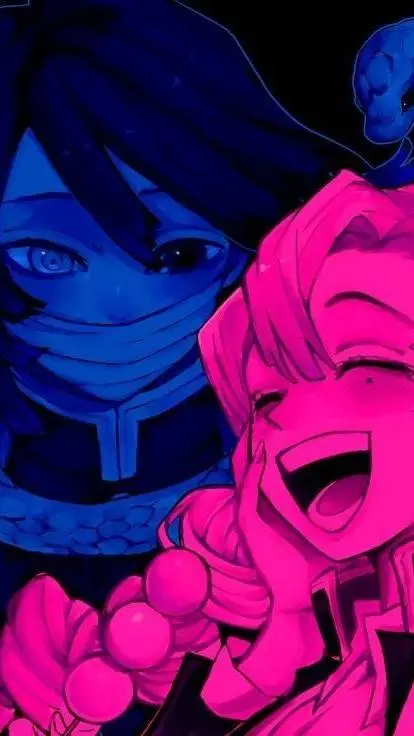 Pale green eyes with small moles under each eye. Her most defining feature would be her long hair usually tied in three braids which is pink and fades into neon green halfway through