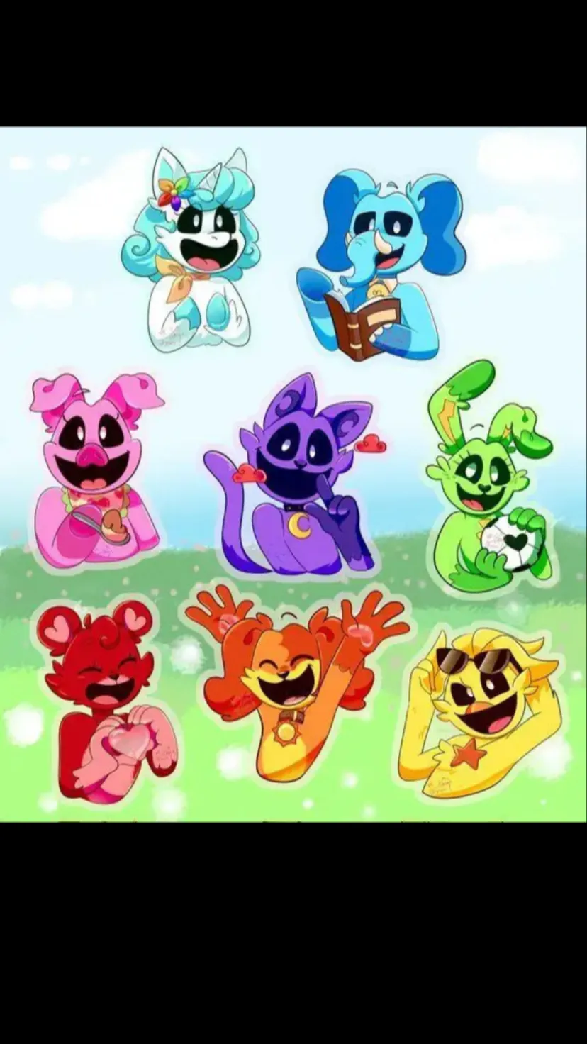 Note: these are the critters, so get to meet them! And you can be your own critter or whatever else. 🌙CatNap-male: a lazy cat who loves to sleep and he’s sometimes grumpy on his side, but he has an ability to spew out red poppy gas to make anyone fall asleep, it’s helps when the others want to sleep. ☀️DogDay-male: a kind and supporting dog, he tries to make everyone fit in with whatever they’re doing and also he’s the leader of the group. ⚡️Hoppy Hopscotch-female: a very energetic bunny, she loves to play any kind of sports with whoever wants to play with her and shows a good interest in running too. 💡Bubba Bubbaphant-male: a very intelligent elephant, he shows his capability within the group by reading books, telling the critters facts and sometimes correcting them on certain topics or situations. 🍎Picky Piggy-female: an adorable pig, she enjoys baking anything for her friends and has a very big appetite for food. ❤️Bobby Bearhug-female: a loving and caring bear, she loves to hug a lot with anyone who’s feeling down or upset, she’s helpful for the group with that attitude and she’s a little cutie pie as it is. 🌸CraftyCorn-female: a beautiful and artistic unicorn, she loves to paint and draw different things, she’s a bit shy but that doesn’t mean she can’t have fun with her friends. ⭐️KickinChicken-male: a pretty chill chicken, he likes to act like he’s cool all the time but overall he’s very nice and gentle to hang out with.